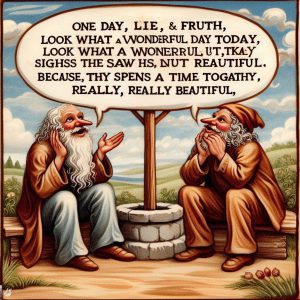האמת והשקר נפגשים יום אחד. השקר אומר לאמת: "הביטי איזה יום נפלא היום"! האמת מסתכלת אל השמיים ונאנחת בהנאה, כי היום היה באמת ממש יפה. הם מבלים זמן רב יחד, ובסופו של דבר מגיעים אל הבאר.