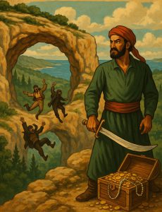 השודדים מצאו מקלט מושלם: מערה רחבה ונסתרת שבלב ההר, מערה שתקרתה הייתה עבה וחזקה כמו מבצר טבעי. פתחה היה מוסתר בצמחייה ובסלעים, והיא שכנה גבוה מעל הואדי העמוק – בדיוק במקום שבו מתנשאת כיום קשת האבן המפורסמת. בתוך המערה האפלה ערמו את שללם: שקי זהב מנצנצים, בדים יקרים בצבעי ארגמן וכחול, תבלינים נדירים שריחם ממלא את האוויר, ופסי משי דקים שהגיעו כל הדרך מארצות רחוקות במזרח.