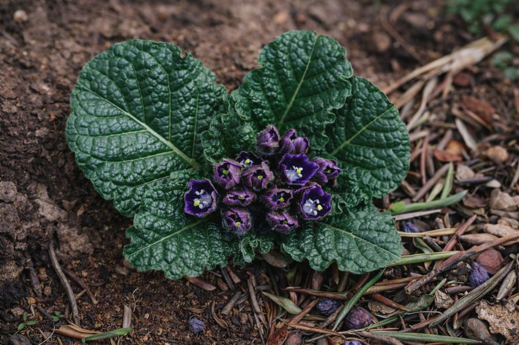 פרחים סגולים־חלביים קטנים שיושבים בין העלים.