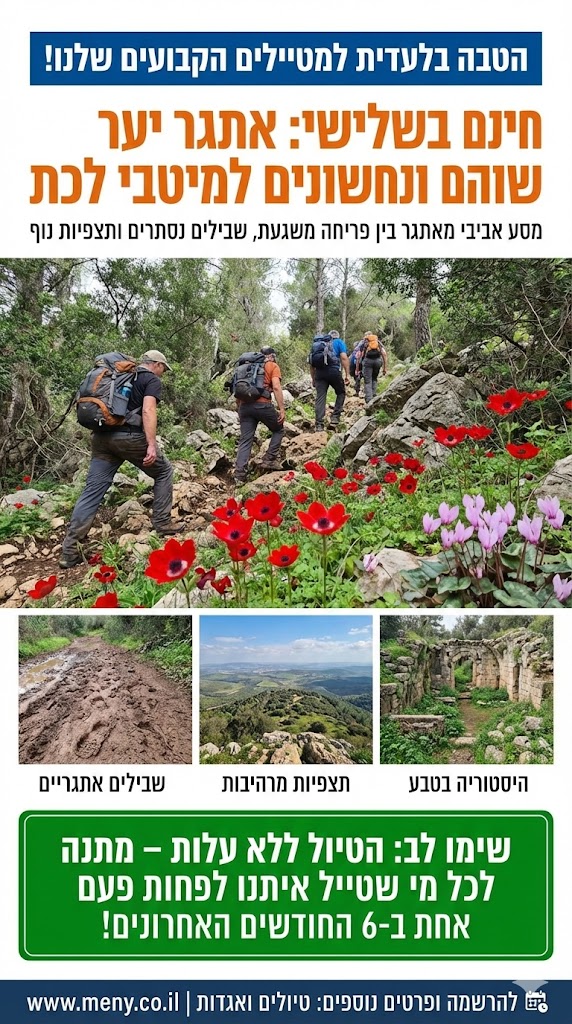 עכשיו, כשהחורש פורש את שמיכת הפרחים שלו, היער מתמלא בצבעים וריחות – כלניות אדומות בוהקות, רקפות לבנות עדינות, נרקיסים שמפזרים ניחוח מתוק, וחרציות צהובות שמוסיפות שמחה לכל פינה. זה טיול ארוך אך נוח, מושלם לחובבי הליכה שרוצים לגלות את הסודות של האזור, מהבוטניקה העשירה ועד למערות וגתות חצובות בסלע. הצטרפו אלינו לחוויה שתשאיר אתכם עם זיכרונות ותמונות שוות פוסט!