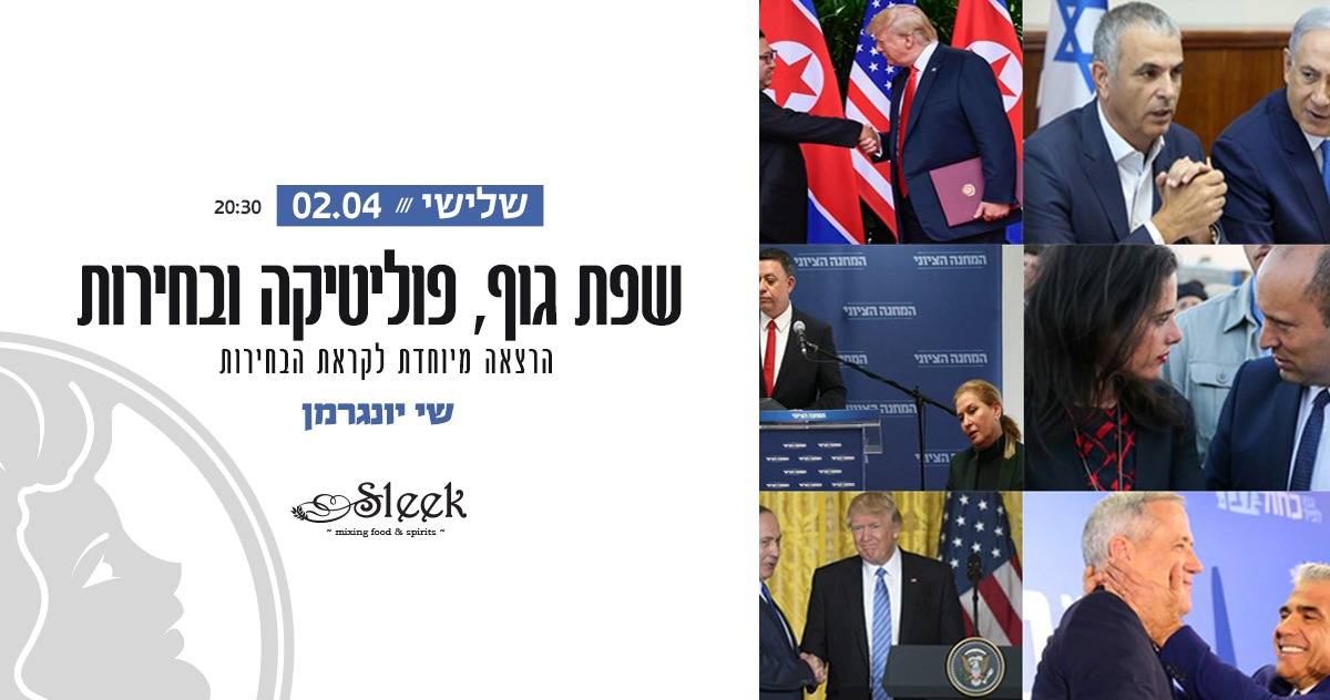 בעקבות ההצלחה של שתי ההרצאות האחרונות בנושא שפת גוף "הסליק", מארח את המרצה שי יונגרמן להרצאה חדשה ומיוחדת לקראת הבחירות. ההרצאה תעסוק בתקשורת הבלתי מילולית ובשפת הגוף בתקשורת הציבורית ובמרחב הפוליטי ביום יום ובזמן הבחירות בפרט. הקדימו לקנות כרטיסים מראש.