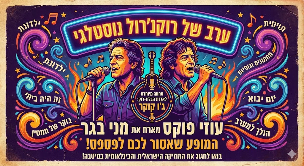 מה מחכה לכם במופע? ✨ להיטים מכל התקופות בעיבודים חדשים ומלהיבים. ✨ להקה חיה ומשובחת של נגנים מובילים. ✨ אנרגיה של רוקנ'רול משובח בשילוב נוסטלגיה מרגשת. ✨ ואורח/ת בהפתעה שישדרגו את הערב לחוויה בלתי נשכחת!