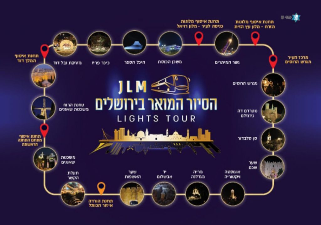 נמשיך לסיור מואר ומודרך בירושלים במסלול דומה למסלול של הסיור המואר. נעבור דרך המסלול המתואר, נרד מהאוטובוס במקומות מרתקים ונצפה בבניינים המוארים והיפים.