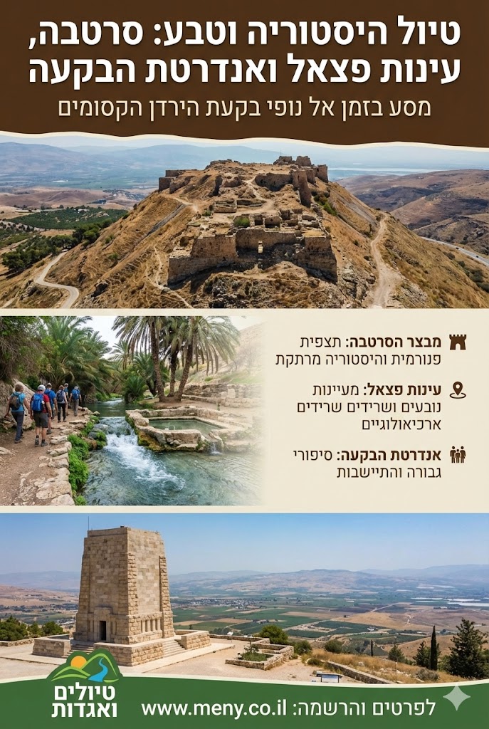 טיול מיטיבי לכת בבקעת הירדן: עלייה להר הסרטבה (אלכסנדריון) עם עתיקות ותצפית עצומה, עצירה מרגשת באנדרטת הבקעה, וסיום בעיינות פצאל – בריכות ומים זורמים במדבר בעונה הירוקה.