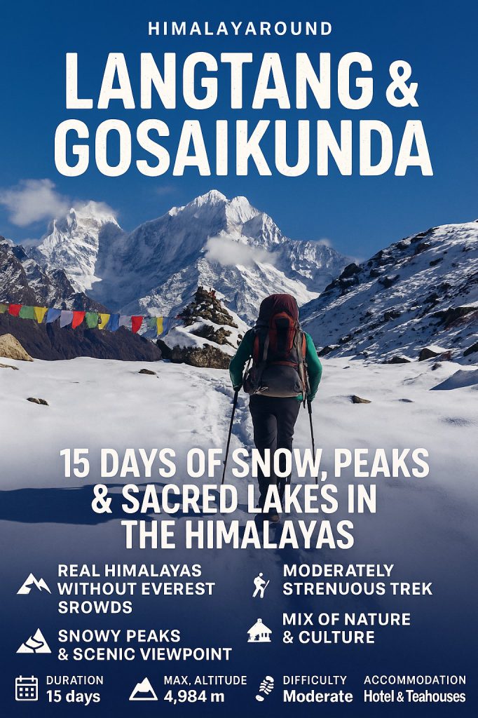 ב־15 ימים נצא מקטמנדו הסואנת, נטפס דרך יערות ונהרות לעמק לנגטאנג, נעלה ל־Kyanjin Gompa ולתצפית פסגה גבוהה כמעט 5,000 מ', נמשיך ברגל אל אזור האגמים הקדושים של Gosaikunda, ונרד בחזרה דרך כפרים הרריים לעמק הירוק – עד שנחזור לעיר עם תחושת הישג של "עשיתי הימלאיה באמת".